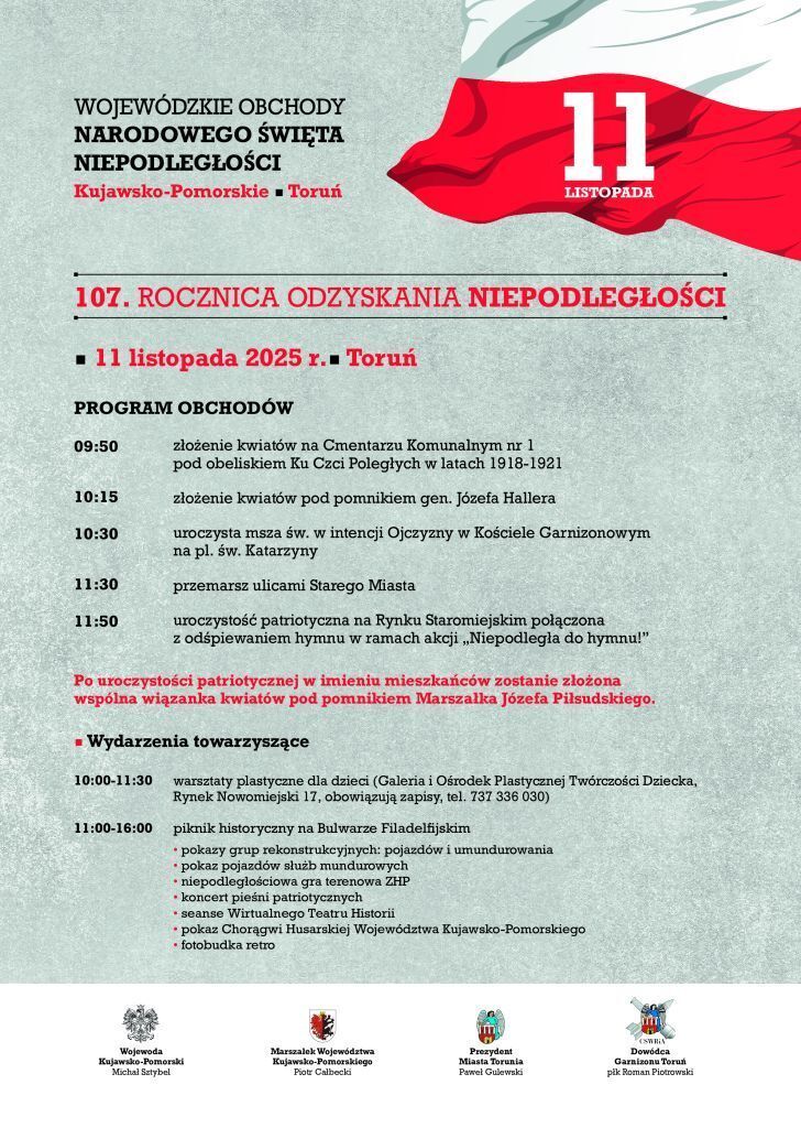 Każdy z nas nosi w sercu kawałek historii Ojczyzny i każdy z nas pisze jej kolejny rozdział. Marszałek Piotr Całbecki, wojewoda Michał Sztybel, prezydenci Bydgoszczy i Torunia oraz dowódcy garnizonów wojskowych w obu stolicach województwa zapraszają na regionalne uroczystości Narodowego Święta Niepodległości (11 listopada). Poza oficjalnymi wydarzeniami w programie także spory segment przygotowanych z myślą o masowym uczestnictwie widowisk historycznych, pokazów i warsztatów. Tradycyjnie zapraszamy też do prywatnego, rodzinnego celebrowania tego najważniejszego z polskich świąt patriotycznych.