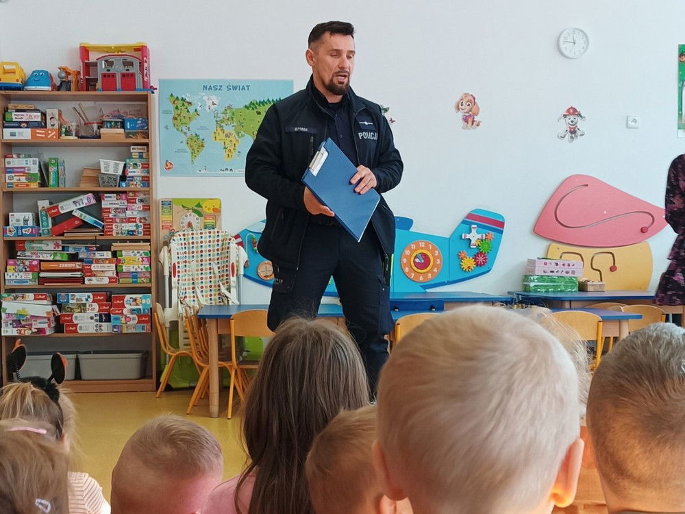 Mł. asp. Andrzej Kuciński omówił najważniejsze zasady ruchu drogowego i zachowania poza domem, w sposób przystępny dla dzieci. Podkreślił znaczenie widoczności po zmroku i prawidłowego przechodzenia przez jezdnię.