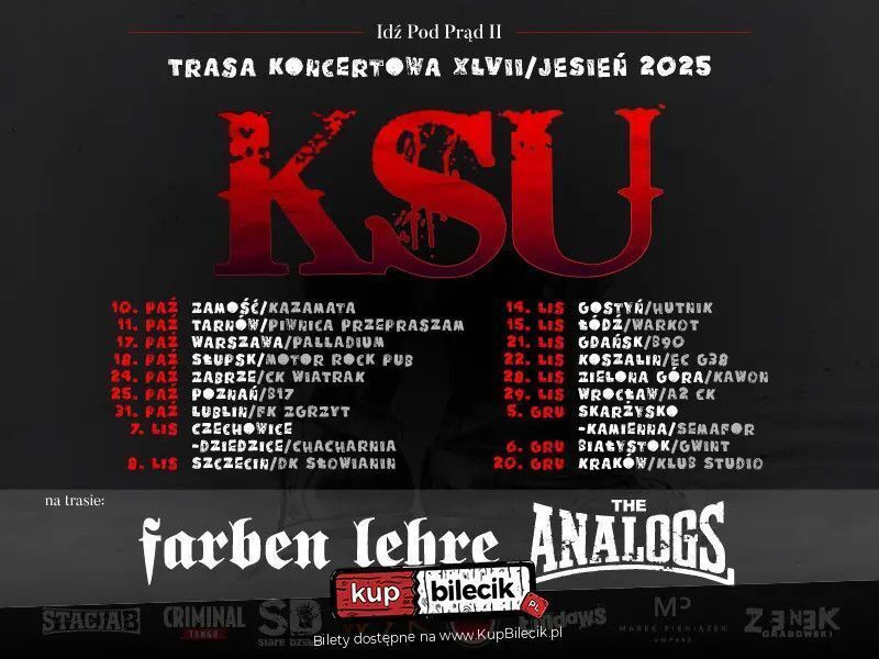 KSU "Cześć Wam! Już tej jesieni zapraszamy Was na trasę koncertową "Idź pod prąd II", podczas której odwiedzimy największe miasta i kluby w Polsce, a także Dodrecht (Holandia) i Londyn (Wielka Brytania). Na koncertach usłyszycie zarówno najbardziej znane utwory KSU jak i te nowsze, w odświeżonej setliście."
