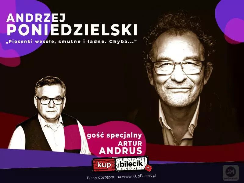 bilety: Andrzej Poniedzielski i Artur Andrus. Piosenki wesołe, ładne i smutne. Chyba... Paweł Jabłoński - piano Tomasz Piątek - klarnet Jakub Chmielarski - gitara Bilety do nabycia na: KupBilecik.plAndrzej Poniedzielski i Artur Andrus artyści: Andrzej Poniedzielski, Artur AndrusAndrzej Poniedzielski - polski poeta, pieśniarz, konferansjer, autor tekstów piosenek, satyryk, humorysta, gitarzysta, twórca scenariuszy, reżyser, artysta kabaretowy i aktor. Członek Akademii Fonograficznej Związek Producentów Audio-Video (ZPAV). Mistrz Mowy Polskiej. Artur Józef Andrus - polski dziennikarz i prezenter telewizyjny i radiowy, aktor, pisarz, poeta, autor tekstów piosenek, piosenkarz, artysta kabaretowy i konferansjer. Bilety do nabycia na: KupBilecik.pl |