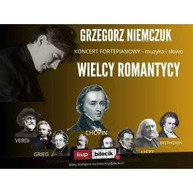 Epoka Romantyzmu była w muzyce reprezentowana przez bardzo wiele wybitnych osobowości. W programie „Wielcy Romantycy” pianista Grzegorz Niemczuk wybrał aż dziewięciu kompozytorów, układając niezwykle zróżnicowany i bogaty program. Publiczność będzie miała okazję usłyszeć wiele bardzo znanych utworów fortepianowych takich jak „Marzenie” Roberta Schumanna, „Dla Elizy” Ludwiga van Beethovena, Walca Johannesa Brahmsa, Suitę Peer Gynt Edwarda Griega czy słynną, wirtuozowską Rapsodię Węgierską nr 2 Franciszka Liszta. Dodatkowo zabrzmią równie piękne i ciekawe utwory Schuberta, Mendelssohna, Chopina oraz Verdiego (w transkrypcji F. Liszta). Bilety do nabycia na: